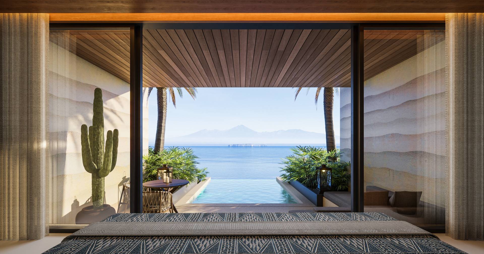 Artist impression of the suite at Rinjani Bay Hotel, with views of the ocean and Mount Rinjani.